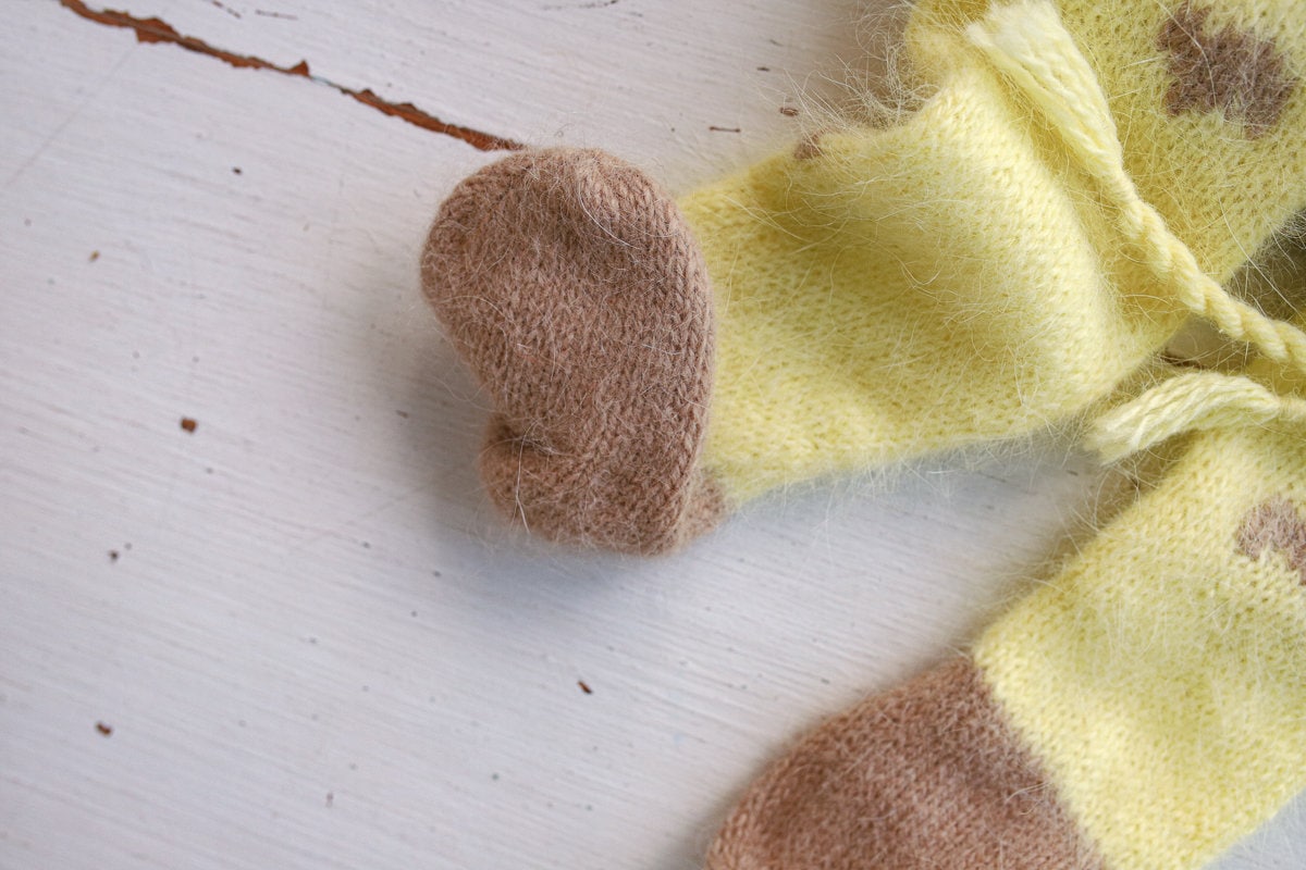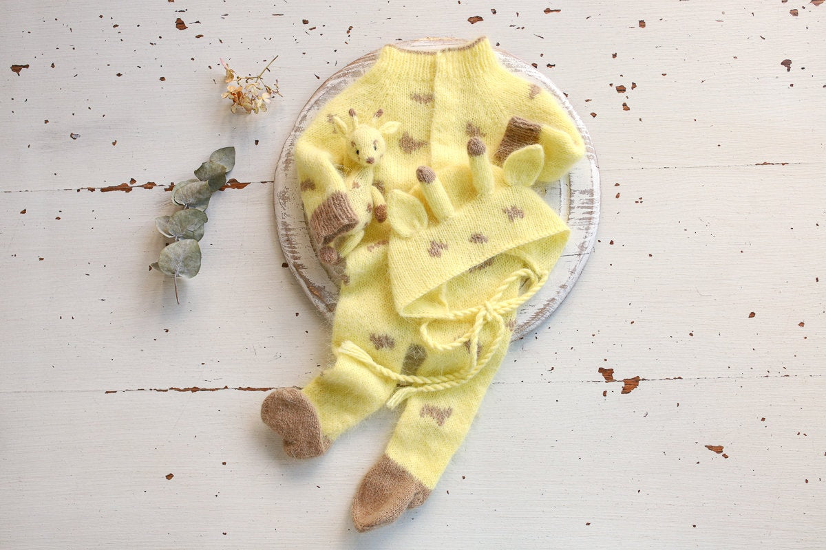 🦒 Knitted Yellow Giraffe Set for Newborn Photography: Discover our charming knitted giraffe set designed to make every moment with your newborn truly magical. This adorable set includes a knitted giraffe Romper, bonnet, and giraffe toy, all crafted from luxurious angora wool.